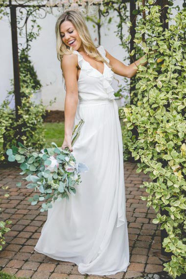 This is an A-Line deep V-neck cross with white ruffled chiffon bridesmaid dress