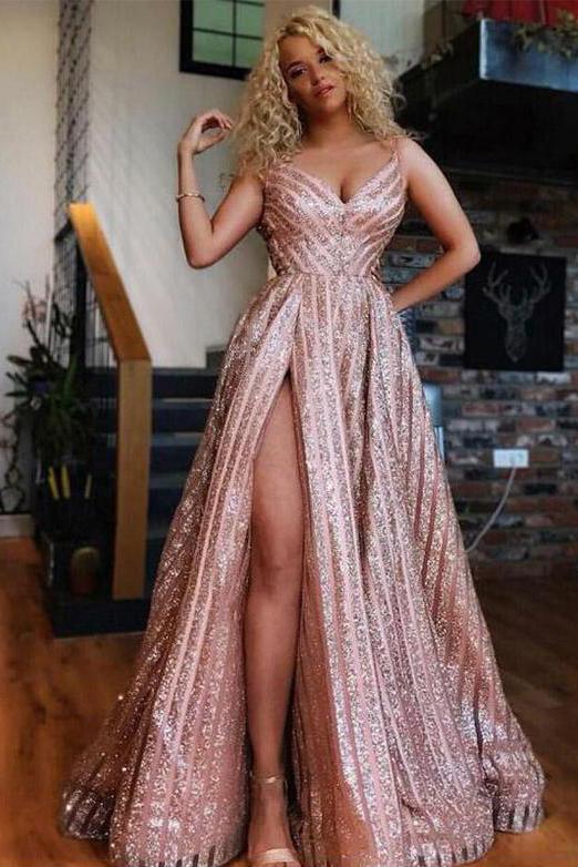 A Line V Neck Golden Long Prom Dresses Evening Dresses with Split Front PDA007